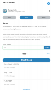 You are now ready to enter one or more Race Results. For each Race, click on Races and create a Race. Ignore the button that says ‘Start Clock’. You use this if you want to use Sail Results for timing during your race.